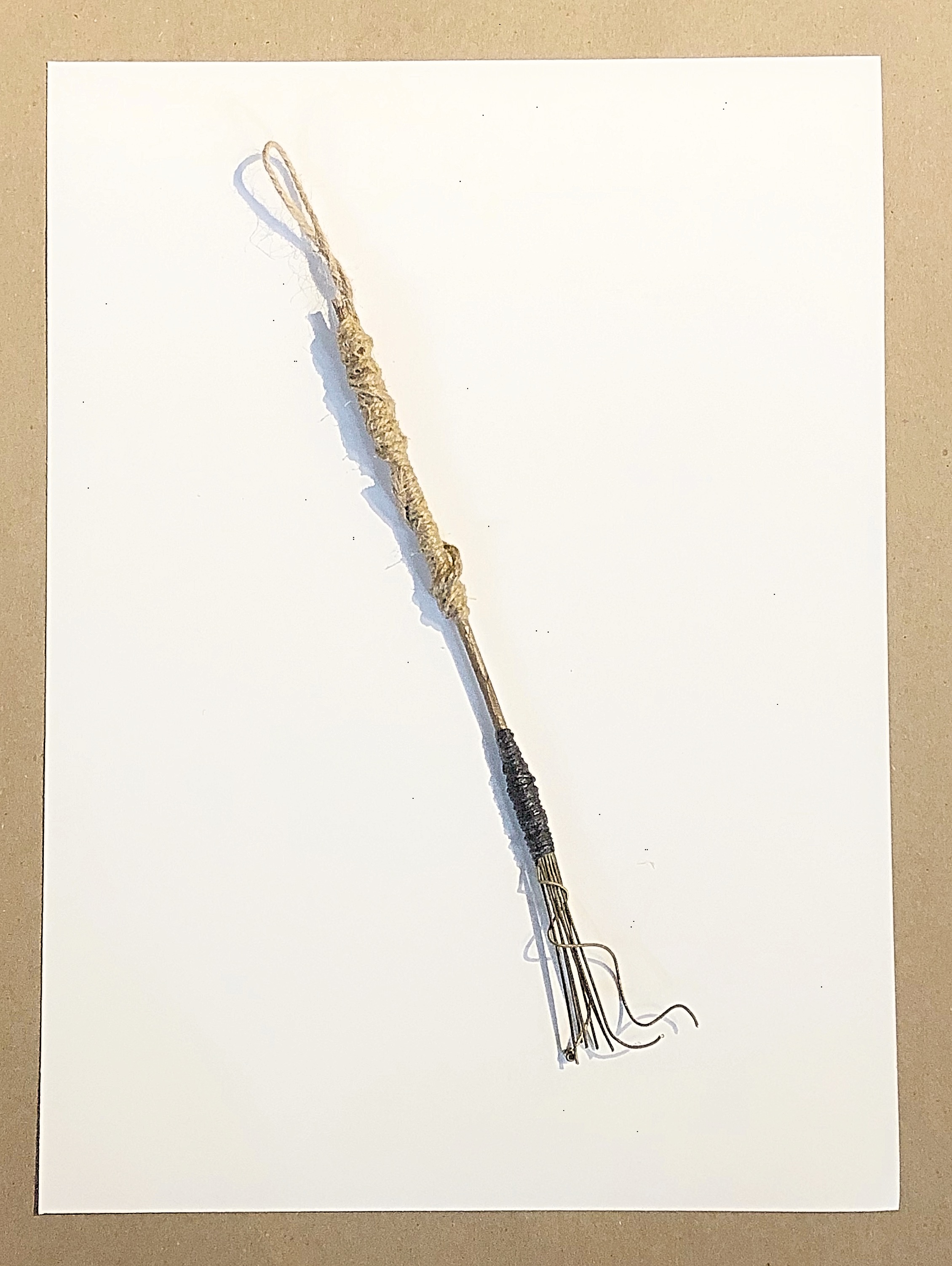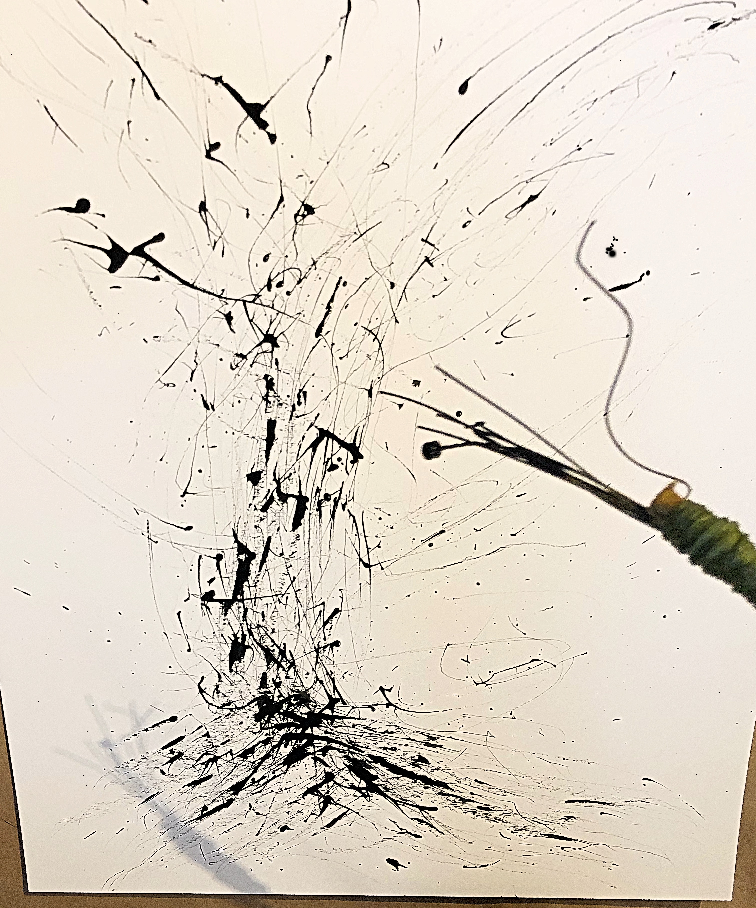 Using a handmade marking brush: the handle is made from bamboo and jute twine, with a few threads of coloured yarn. The brush is from cut-up strands of guitar chords. The India ink pooled onto the thicker cords and left drips on the paper, which the finer chords were able to move around. I saw the tree emerge as I sped-up my brushstrokes.