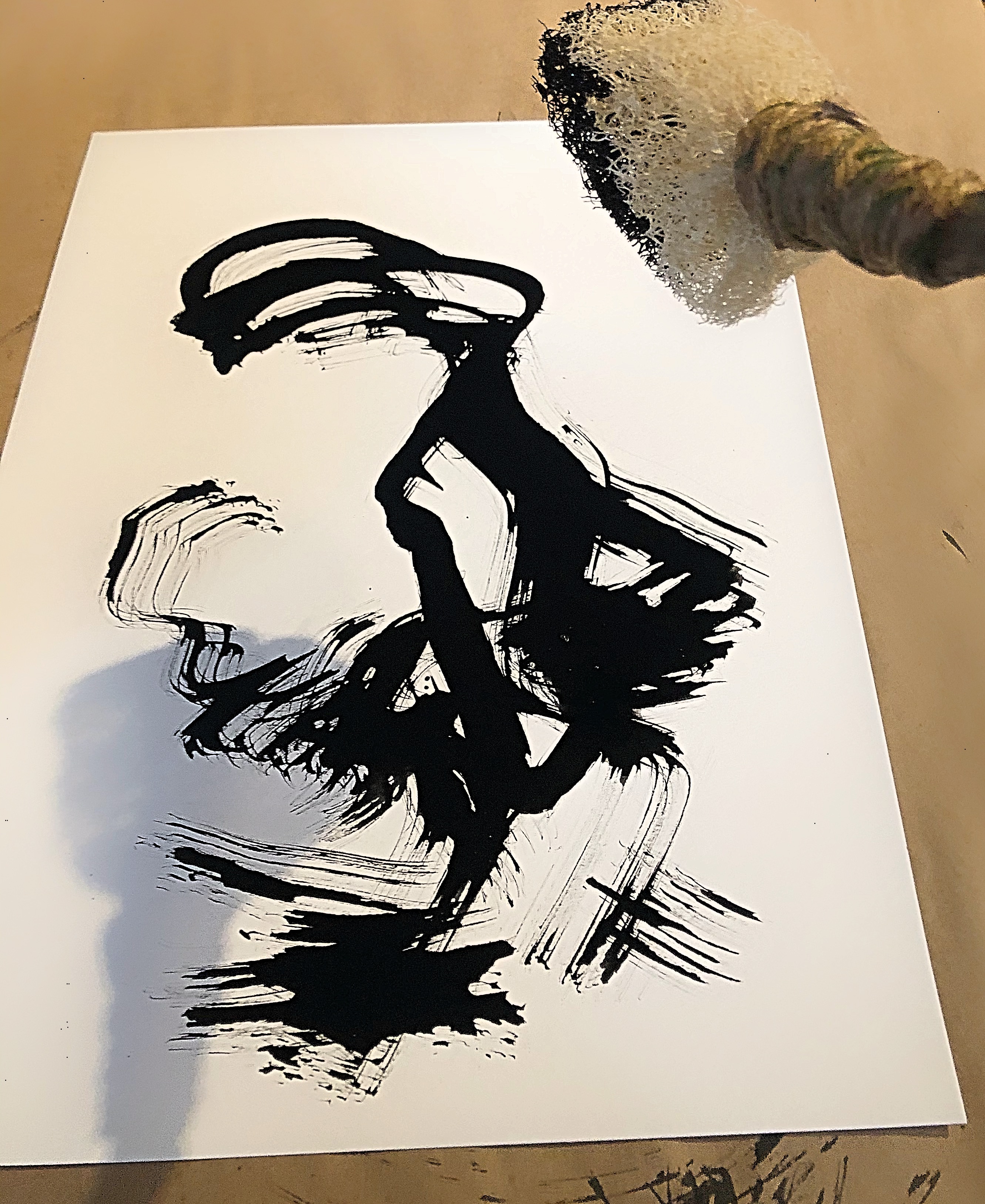 Using a handmade marking brush: The handle is a cutting from a maple tree with jute twine and some coloured threads. The brush is a piece of an old loofa sponge (sea cucumber). The one used for this drawing was cut and attached transversely to the handle, to give a broader stroke. The India ink soaked into the brush as expected for a sponge. I tried a few images and when I pushed the brush down too much, the ink pooled onto the paper in amorphous blobs. The lighter touch allowed for more variation in line and gesture.