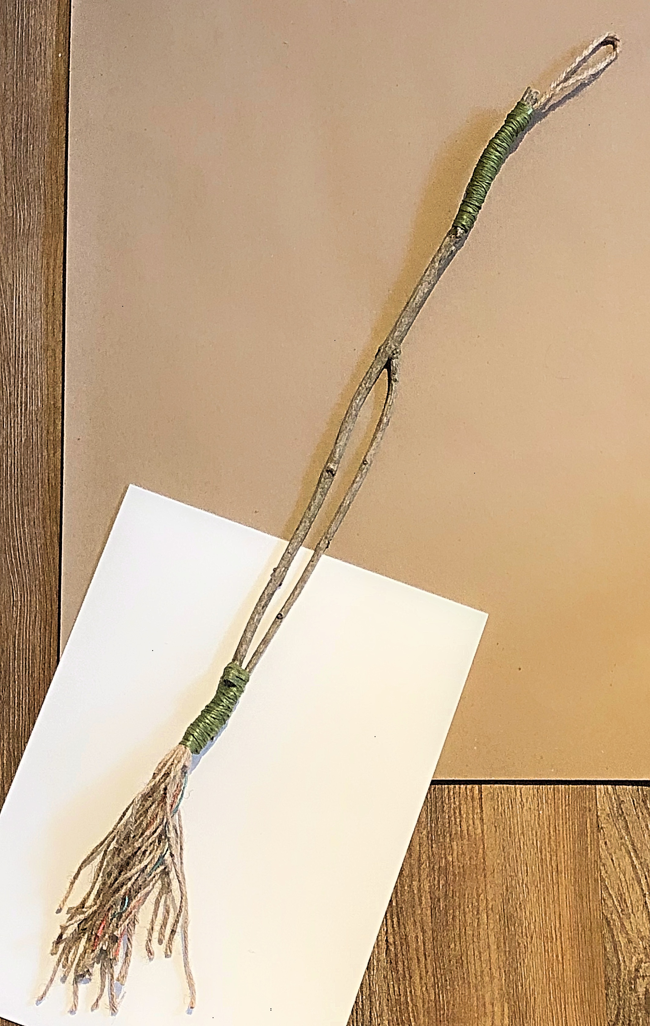 Using a handmade marking brush: The handle is a little over 60cm long, made from a maple branch cutting and bound in coloured treads and jute twine. The brush is also jute twine.