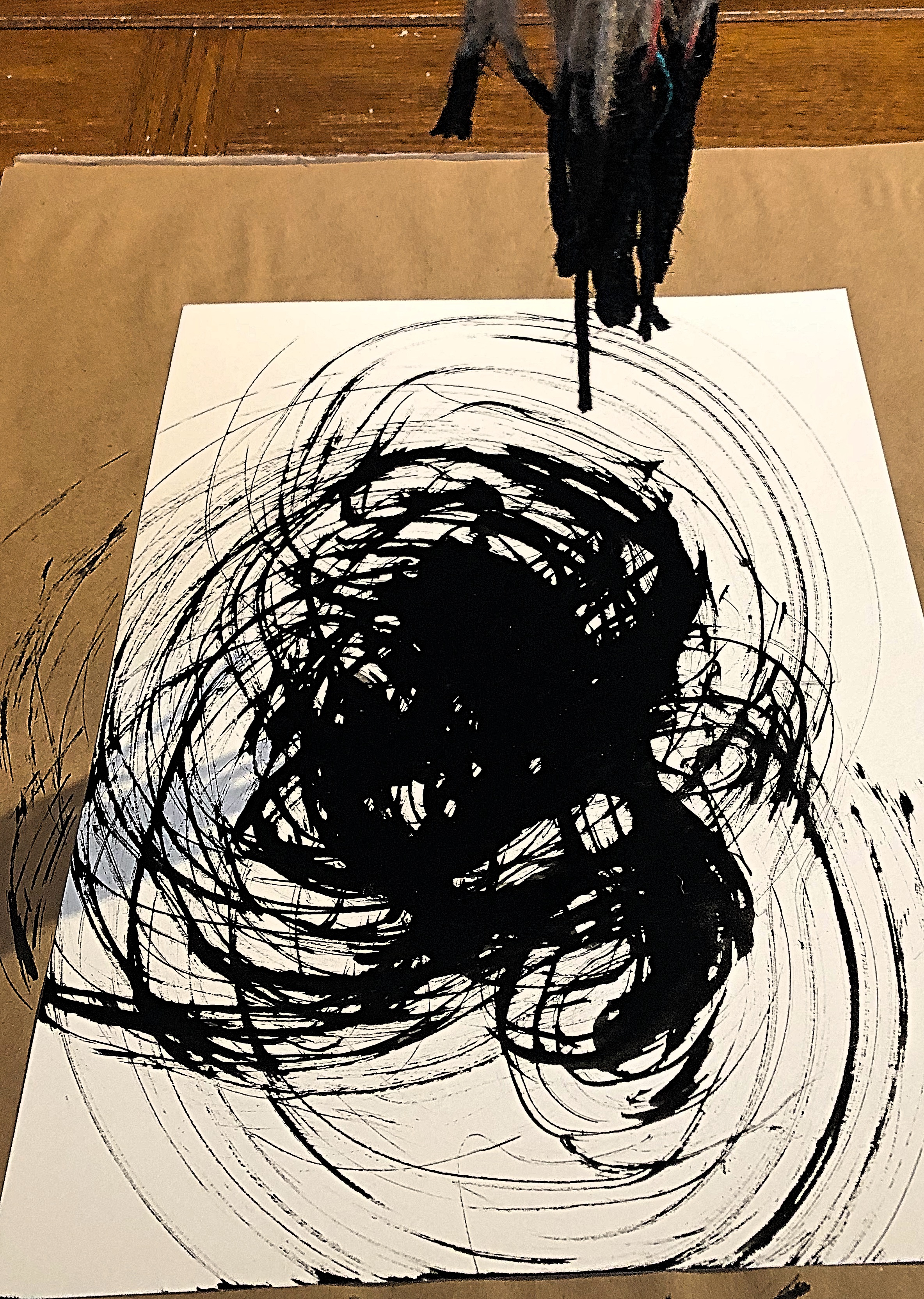 Being one of the first brushes I tried for this project, I wanted to stay simple and see how circular movements could be achieved. The jute held lots of ink and it pooled on the paper so I needed to move it faster to get finer lines. When I let it dry and turned it vertically, I saw the spider in the center of the page; It was facing left and in its grasp, we can see the terrified figure. The figure is outlined by its eye that looks down on the spider, as well as its profile (nose, open mouth) and the slender arms also caught in the spider’s pincers.