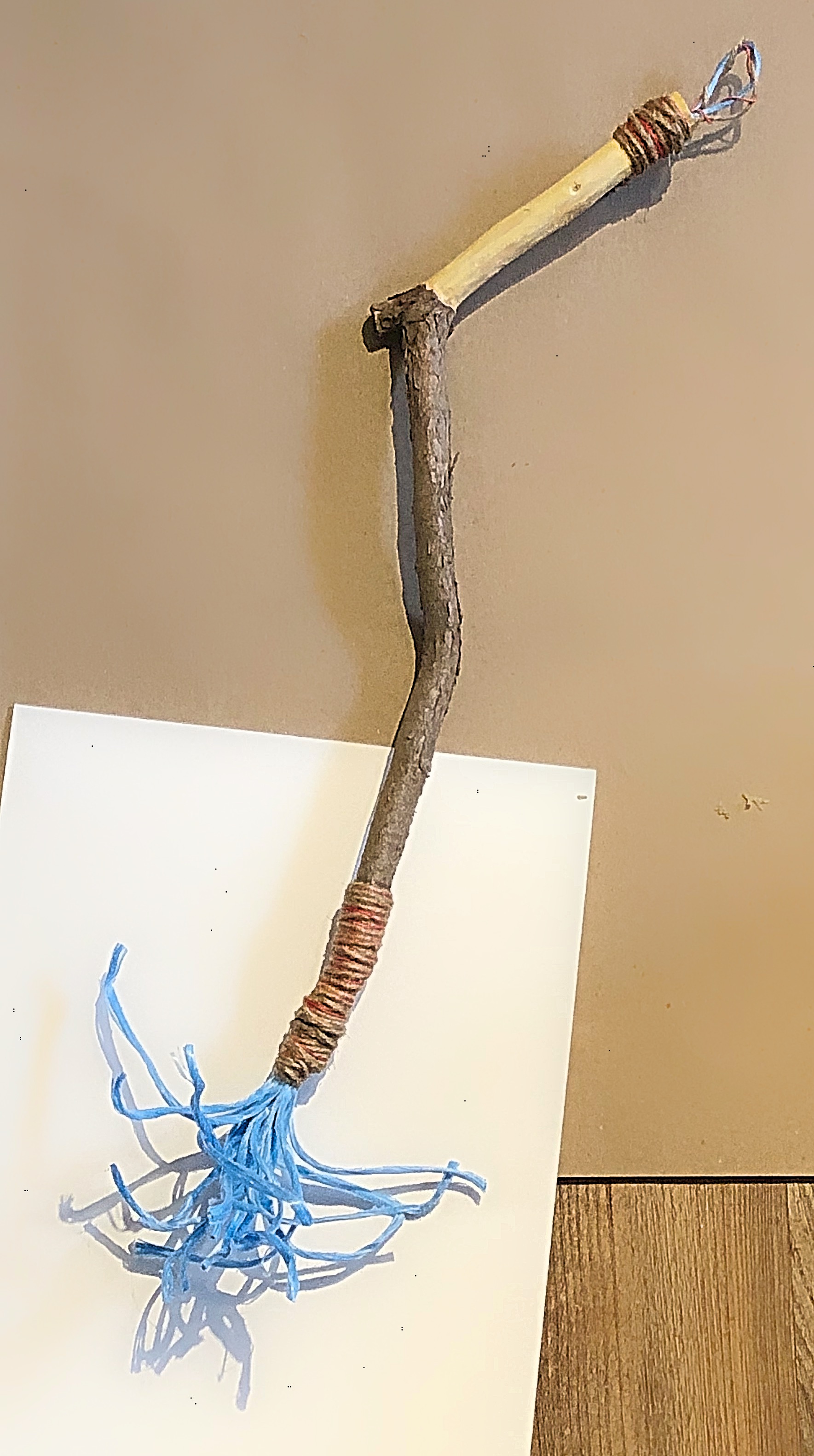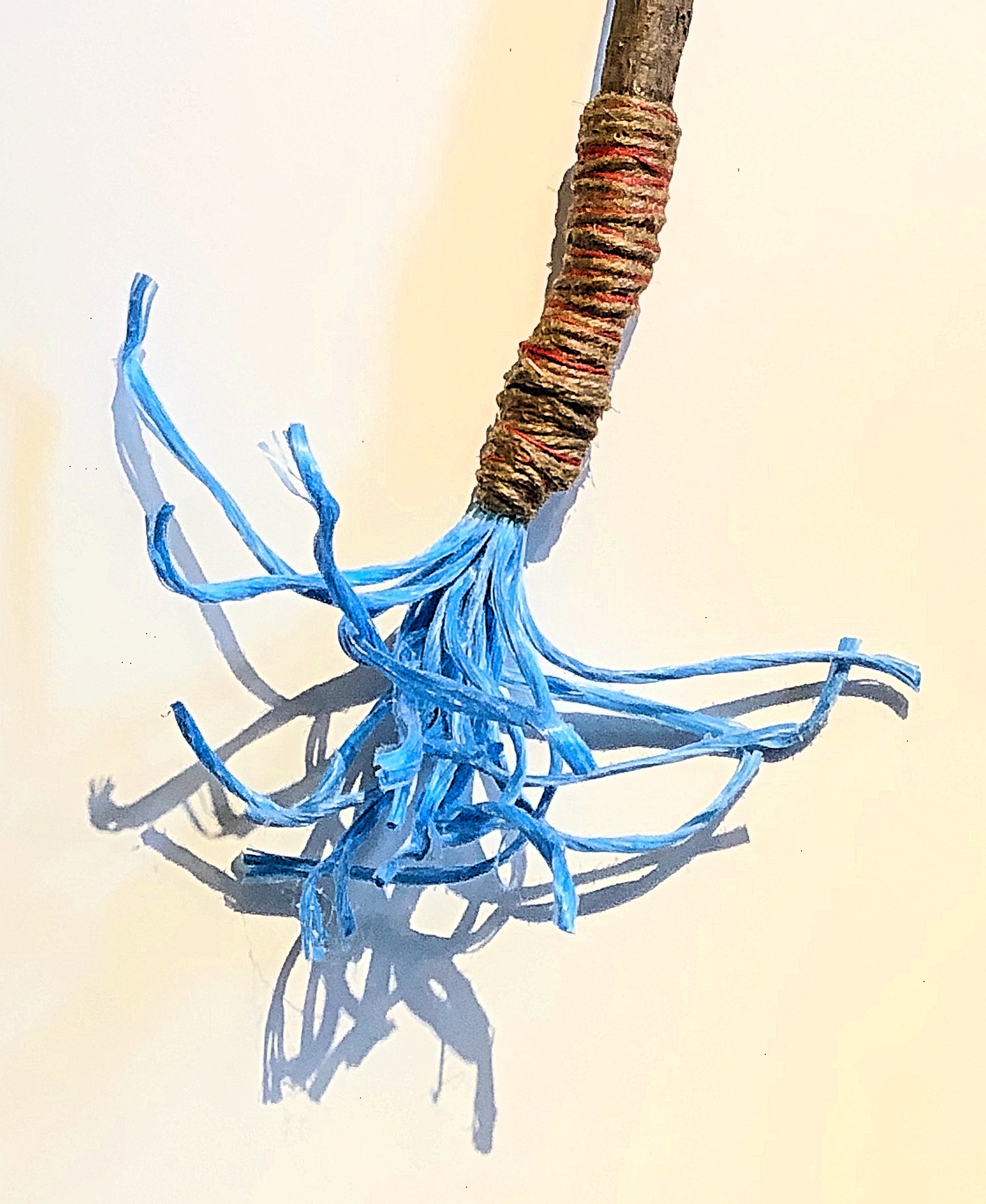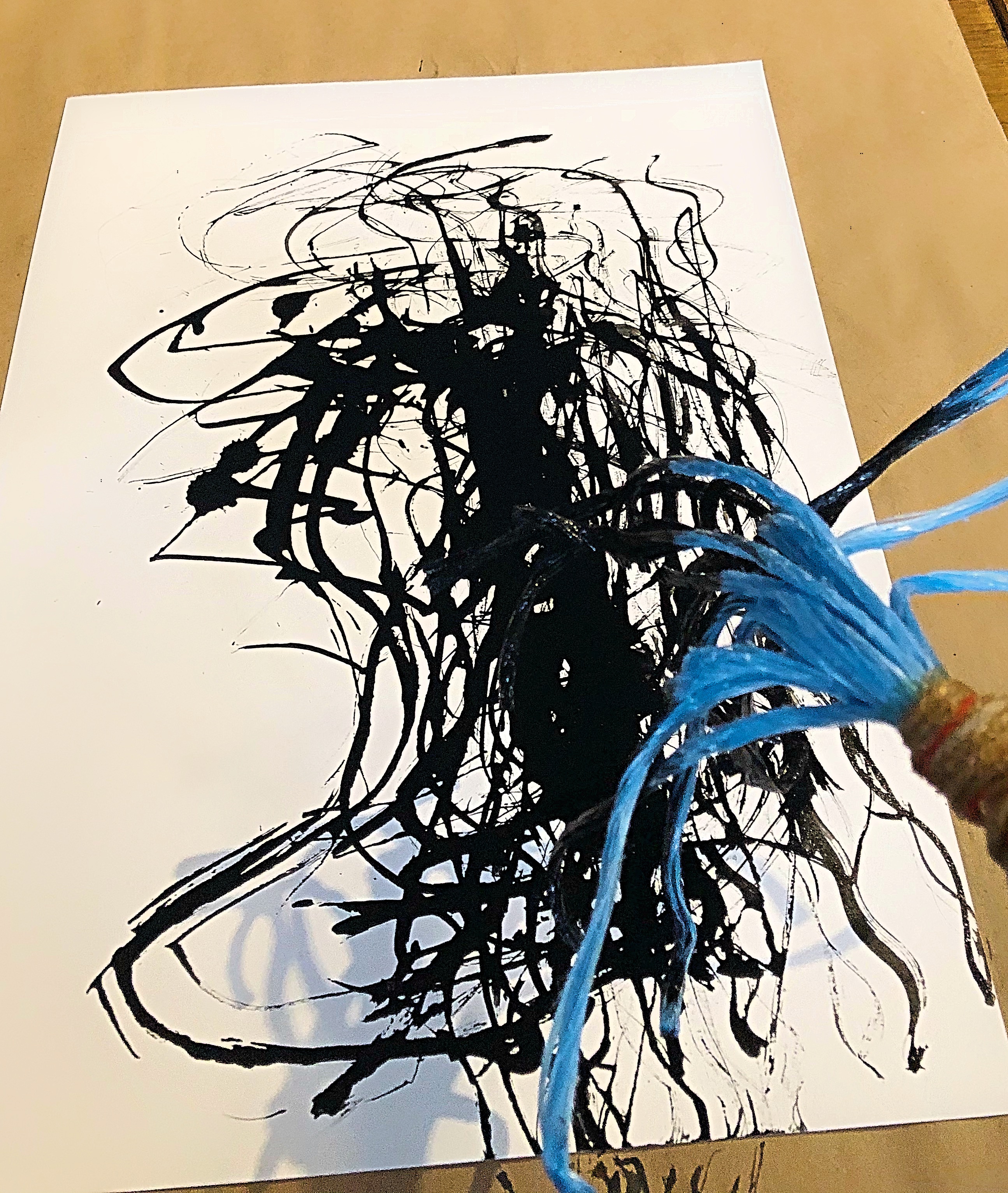 Using a handmade marking brush: The handle is cut from a cedar branch with jute twine. The brush fibres are nylon bundling rope salvaged from the hardware store. The India ink surprisingly soaked into the fibres and dripped onto the paper… The fibres got more straight with the ink soaked into them and this allowed me a little more control over the lines and marks I wanted to make.