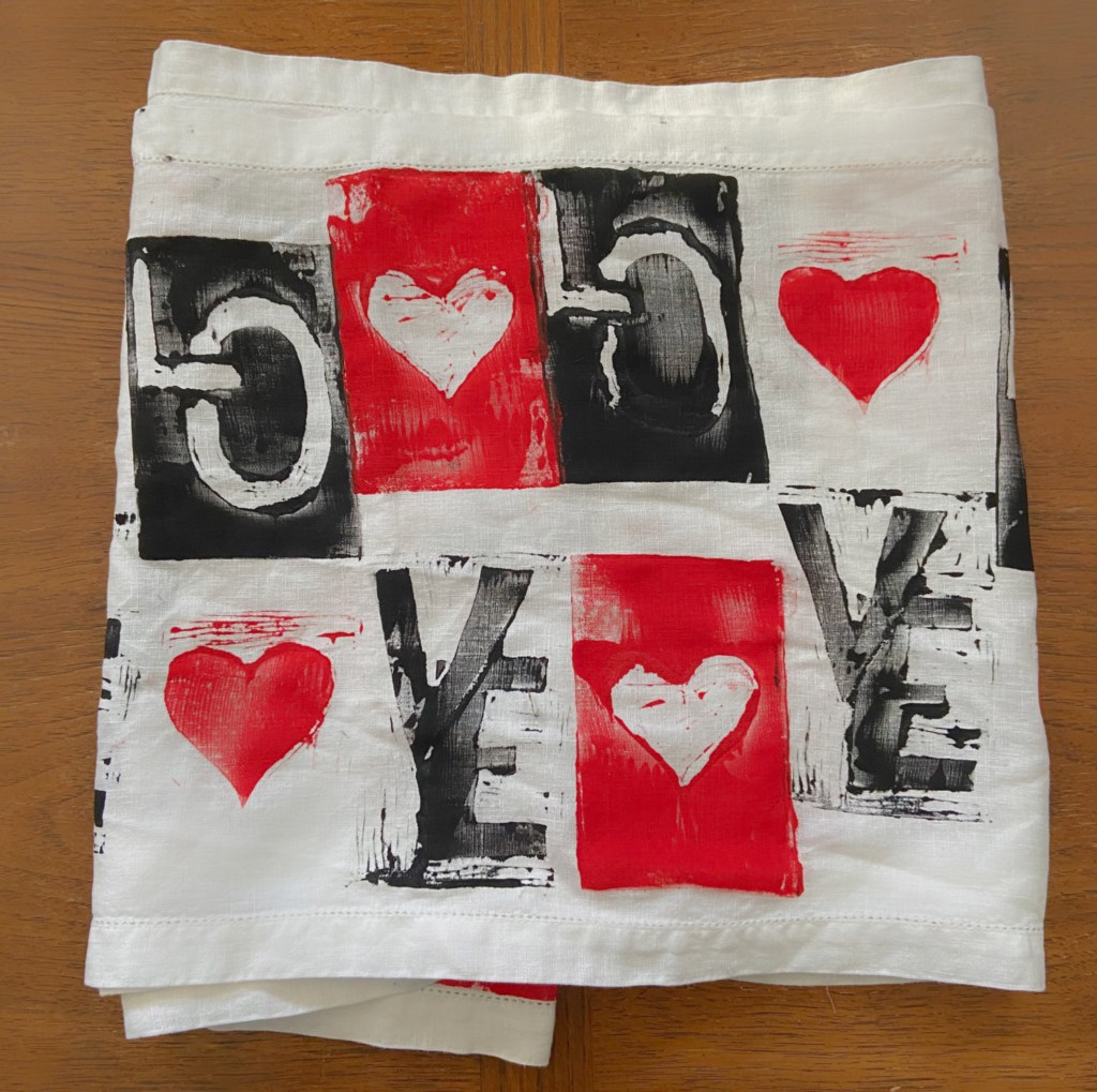 - 2- Repurposed table runner – Modified pattern, focused on alternating black & red on creme table runner. Can be used as a scarf. In the photos, will be part of silly-installation.