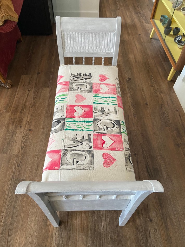 The seat was reupholstered in a piece of hand-printed, raw canvas.