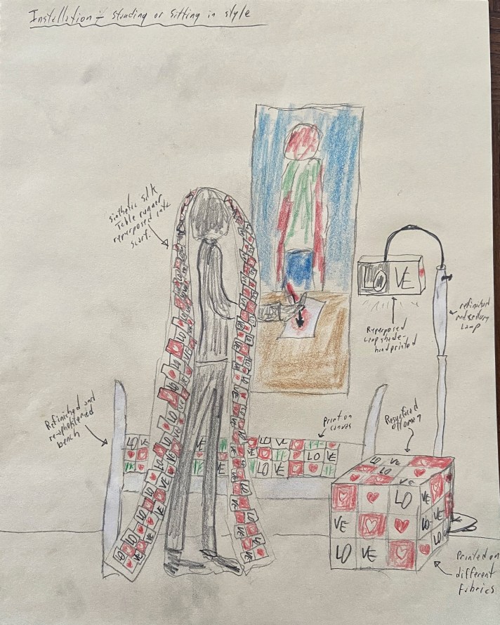 Originally intended to be worn as a silly head covering (see sketch) for the installation, but was borrowed as a scarf and that is now what it is.