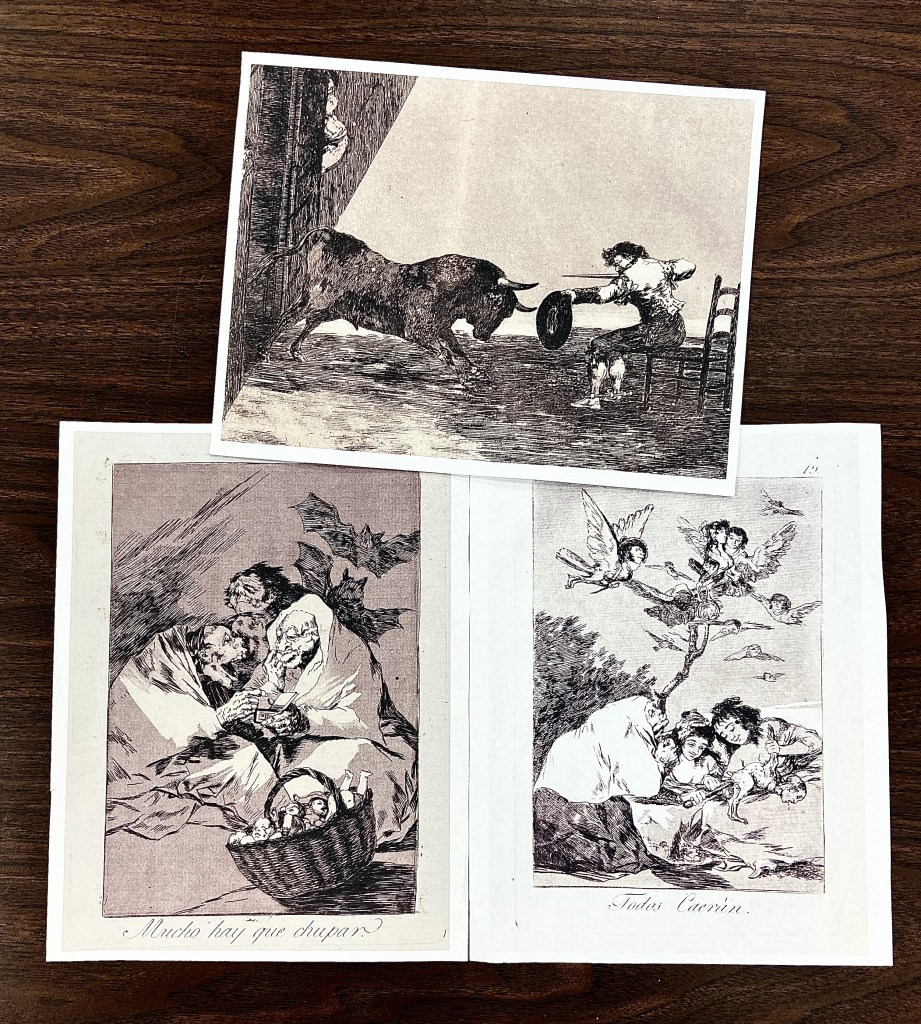 Over two years ago I was challenged by a drawing teacher in an exciting way: He called them Goya Squares. He cut-up (photocopies) of Goya & Durer etchings into small 1″ square(ish) pieces so we couldn’t recognize the original artwork. He captured my curiosity when he suggested we don’t look for the original these pieces came from; instead we should allow out imaginations to extrapolate them into something completely new… we were told to use nib-pens or very fine markers… colour was optional and not encouraged for the drawing part. I’ve been wanting to try this again for quite some time and just haven’t been motivated to do it. I didn’t want to remember the original work, but didn’t want to ask anyone else choose the pieces. So, I picked three works I felt had potential, printed them out and placed them face-down on my desk for a couple of weeks… hoping I’d forget my choices. I then randomly cut up my print-outs without looking at them. Then I mixed up the pieces and turned them over, before selecting these to work with.