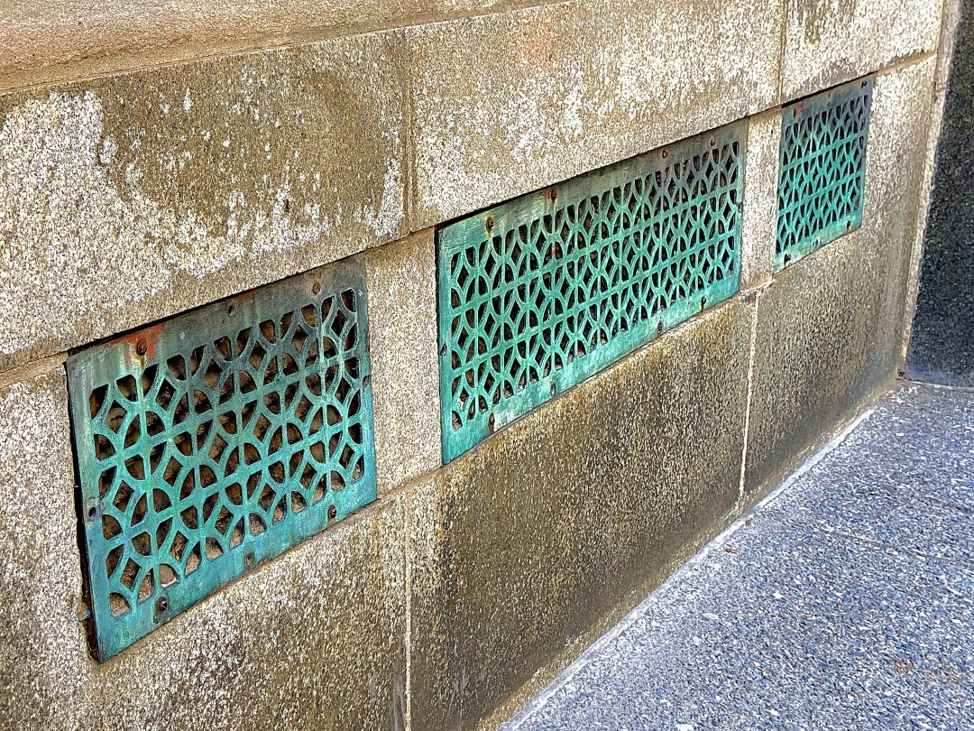 The foundations and corner stones around the older edifices of the city often seem incongruent with the buildings they support and I’m sure if I were to do a little research, I’d find images of the original structures. I often let my imagination run free and wonder if the original openings in the foundations might have been for coal chutes or over-door windows on long buried cellar entrances. In the case of these bronze grates, they seem very out of place on their current vertical surface. Their excellent condition and lack of hammer marks brings me to conclude they may not have been an original accoutrement for this building. The reason I wonder if they may have been grates, is that many of the older banks often had bronze ones near they doorways, and I could easily imagine these having been reused from that original purpose.