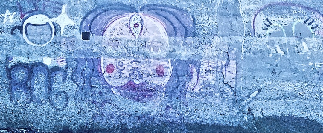 The day was blisteringly hot and the river was churned by the strong winds I was rowing against; my phone, my only camera, and the possibility of success greatly hindered by the constant water spray, blinding sunlight, and unsteady preach of the kayak where I sat to take this shot. Not all walls are accessible by walking around the city, some are hidden and only possible to capture when the timing is right. This Graffiti remains hidden most of the time and I saw only the third eye on my first rowing past it, but this day the water was very, very low and the whole mural with all the attempts at complimentary additions appeared. The faded band across the eyes may be due to years of scrubbing by ice during the spring thawing. I feel it adds to the mystery of possible symbolism intended by the anonymous artist. You can find this wall about one kilometre west of the Jacques-Bizard bridge in Sainte-Genevieve, Qc. There are very few concrete retaining walls left in this area and it is my understanding no more allowed, so this may be the only Graffiti of this sort in the area.