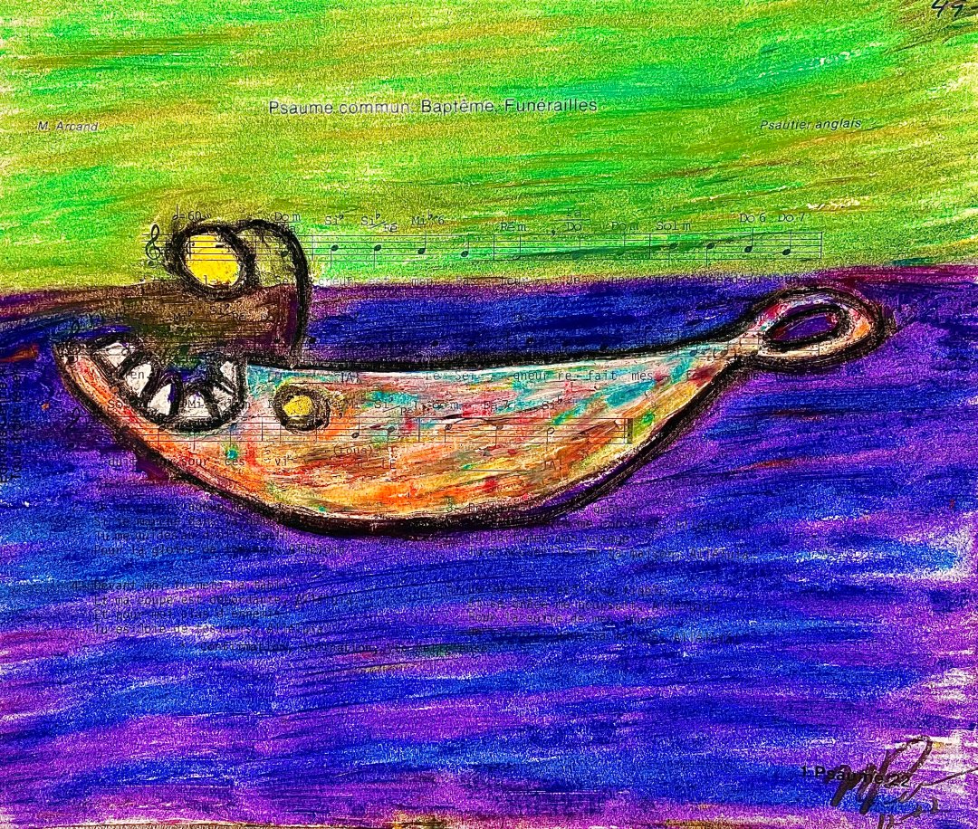 Imagine the adaptation here: the bioluminescent orb only works above the water surface and the fish only perceives black and white contrasts… it only sees the shadow off some organism floating on the surface directly below its orb and then it can rise for the food to enter its mouth. Being so close to the surface makes the fish vulnerable to attack, but its fearsome row of teeth may also frighten away predators… al teals, those who can see them. Perhaps not the most efficient design, but amazing to think about. I’m really enjoying the way the horizon if dragged back by the colours. Also, there is some tension in the optical effect. of the fish being flat on the surface of the composition… is it under the water, or flying over it?