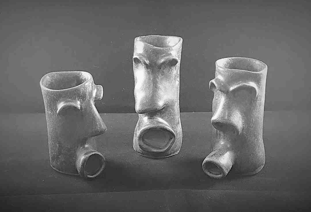 Three sculptures arc into a conspiratorial semicircle —