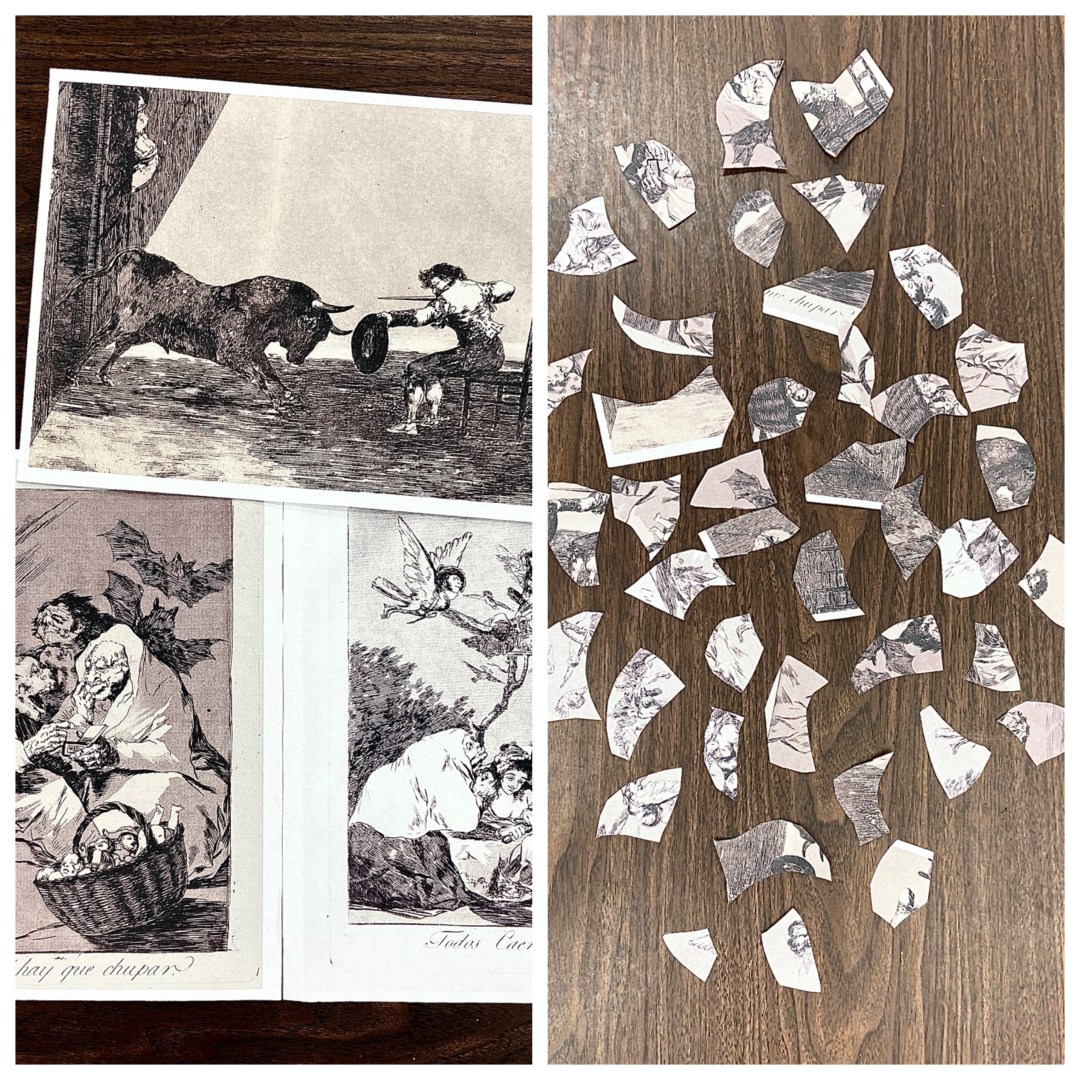 Quite some time ago, before Covid... my drawing teacher asked us to do what he called Goya Squares. The premise is that he cut of (photocopies) of famous Goya etchings into 1" squares; we were to take between one to three of them, place them on a large white sheet of paper and draw outwards … Continue reading Creative Blocks – Goya Squares Continued