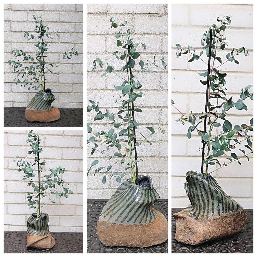I made this abstract vessel many years ago and I've never published a picture of, I think. I was in a dark place when I made it and didn't really like it at first. It has moved around with me and gradually has found itself in more visible places. I recently had it in a … Continue reading Transformations with Life #16 (Raku and Living Eucalyptus)