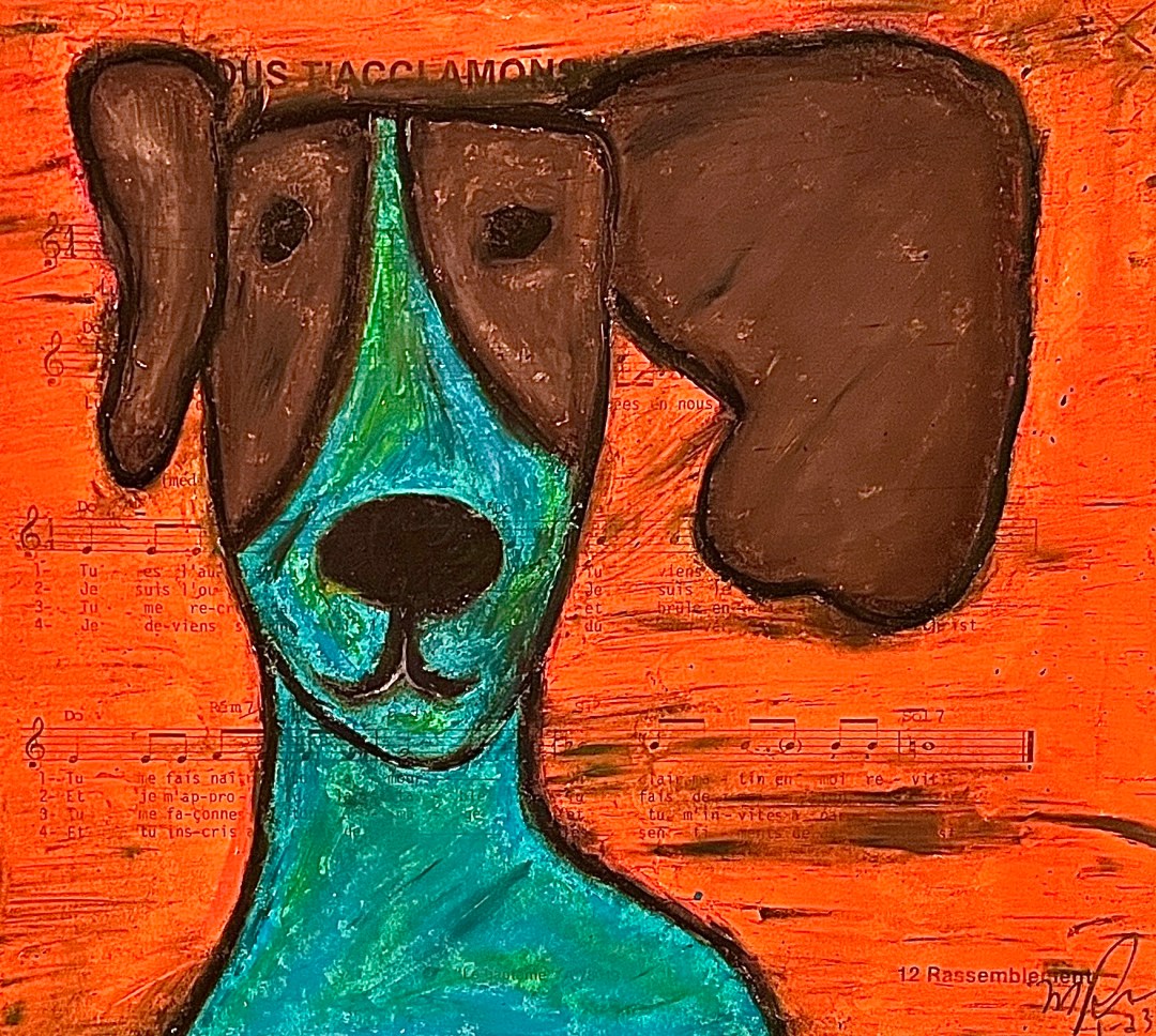 I came across an image of a puppy face that reminded me of the expression of curiosity I so often see on my puppy's face. It was a black and white drawing and my mind almost immediately imagined it done as a series of offset prints in the Pop Art style pioneered by Andy Warhol. … Continue reading Pup in Orange – Sheet-music Scribbles 2023