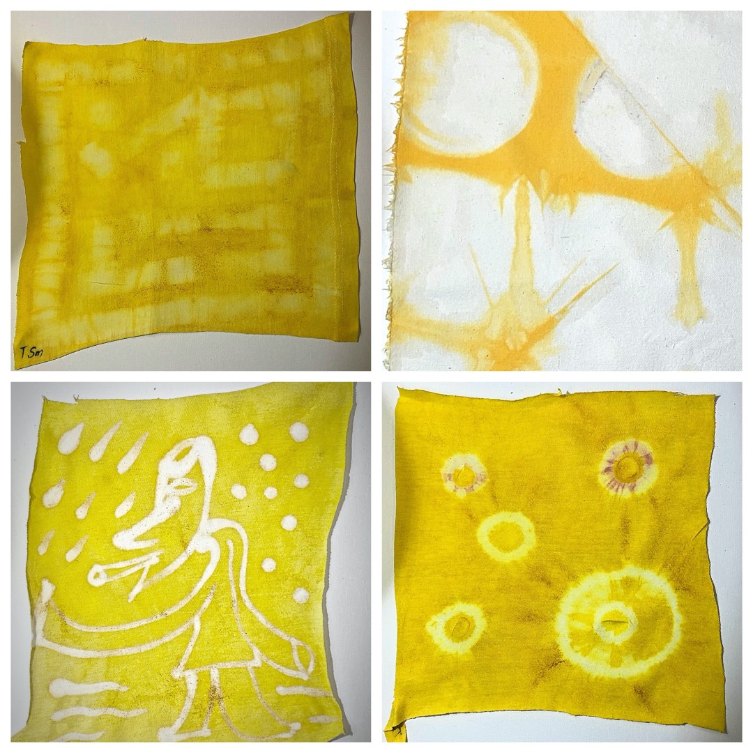 What you'll see here are 3 pieces of cotton and one of raw silk... all soaked in an alum mordant. The cotton is soaked in a cool turmeric dye bath. The raw silk was soaked in an acidic food colouring bath. (Made from watering down a direct application colour paste: alum, guar gum, vinegar, & … Continue reading Fabrics – Colour Mapping Challenge – Part 2 – Some Resists & Removals