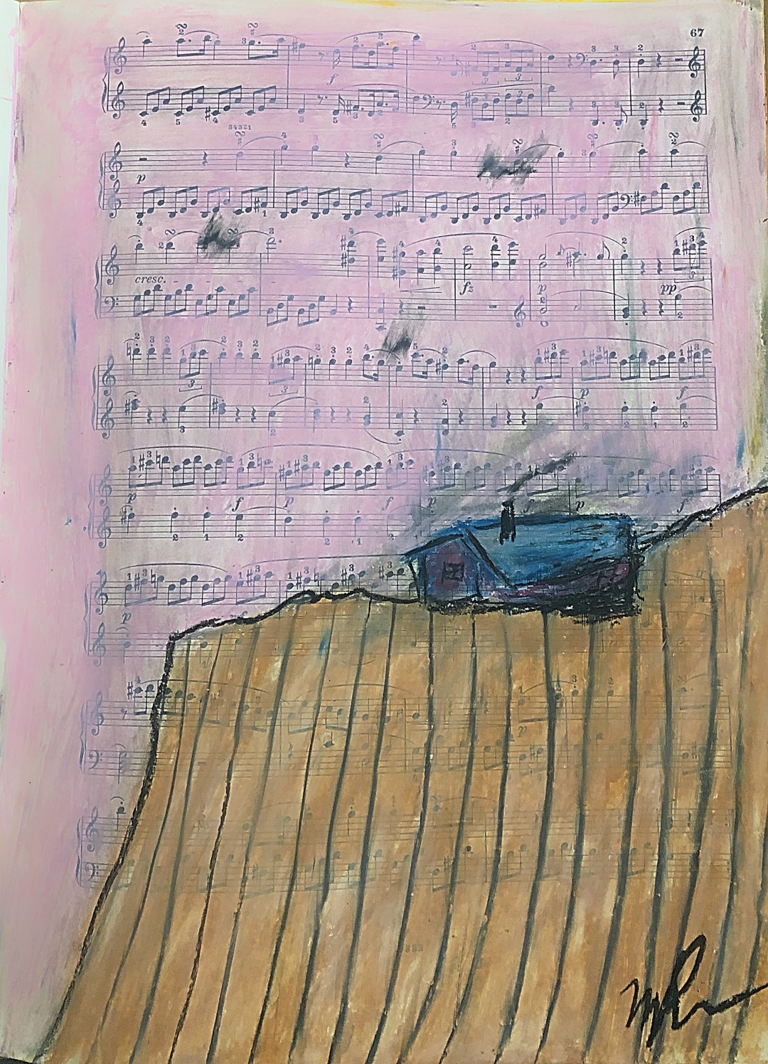I've been staring at this for over a week now and trying to imagine a grassy horizon line... hoping it would cut the page and add tension between the foreground and sky. It feels wrong or in complete at this point... just a random line that floats in space without attachment to either the foreground … Continue reading Isolation Landscape – Repainted on Commission – Initial Horizon